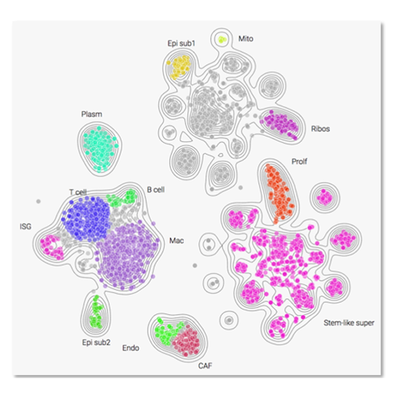 FGI cloud maps group expression data into cell types and gene function clusters (subpopulations) based on a systematic biological classification e.g. tumor cells, normal cells, immune system, and vascular system, as well as interferon-stimulated genes, etc. This allows for easier analysis and validation of expression levels.